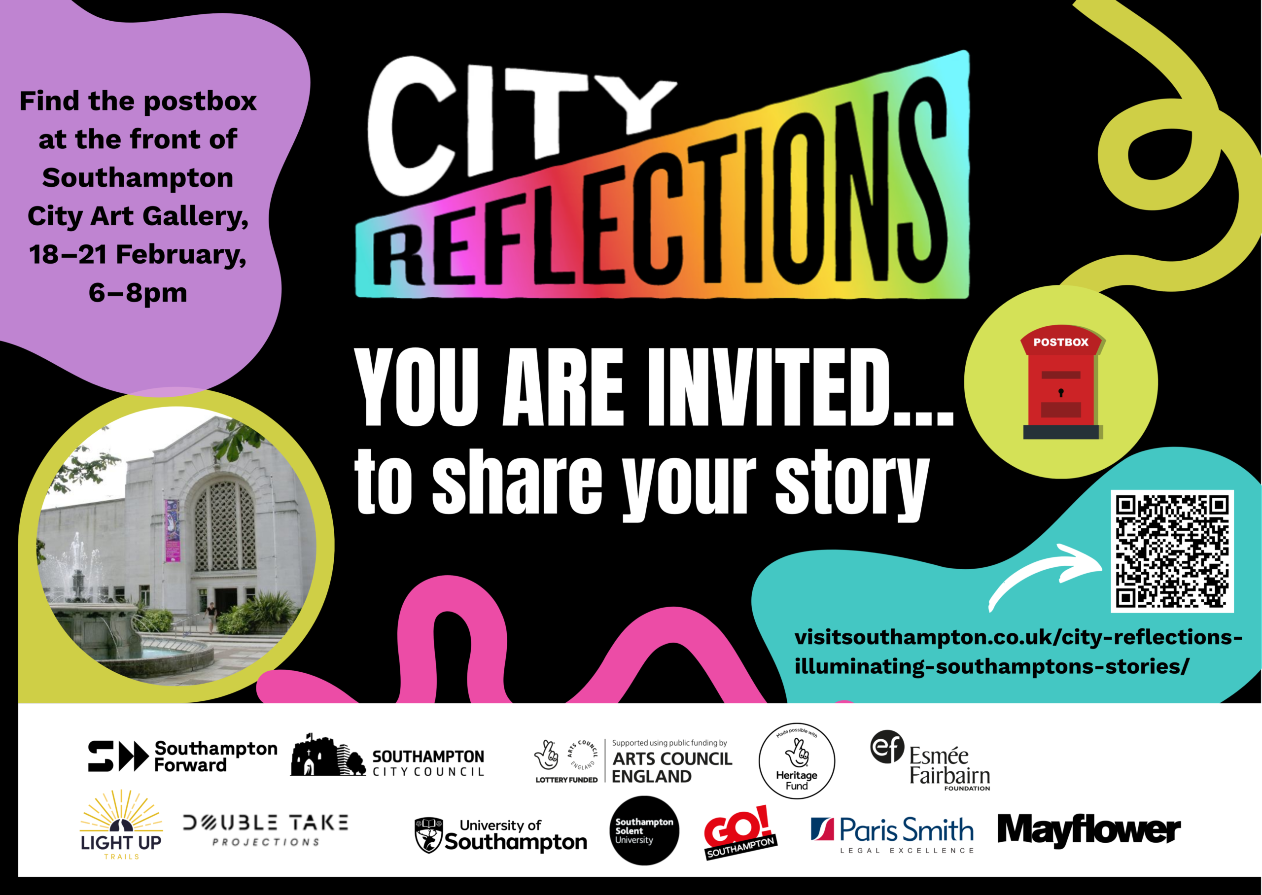Presented by Southampton Forward in partnership with Southampton City Council, City Reflections is created with Light Up Trails and Double Take Projections, supported by funding from Arts Council England, the Esmée Fairbairn Foundation, and The National Lottery Heritage Fund. The project is also supported by Southampton Forward’s founding city partners: Southampton City Council, University of Southampton, Southampton Solent University, GO! Southampton, Paris Smith, and Mayflower Theatre.