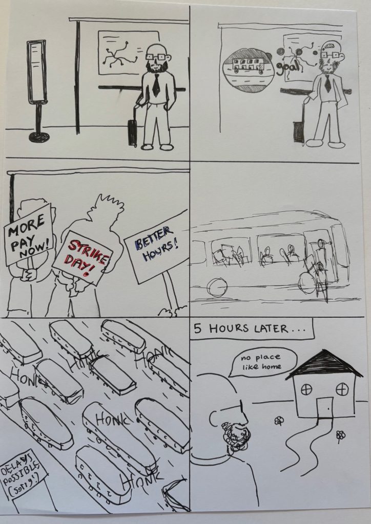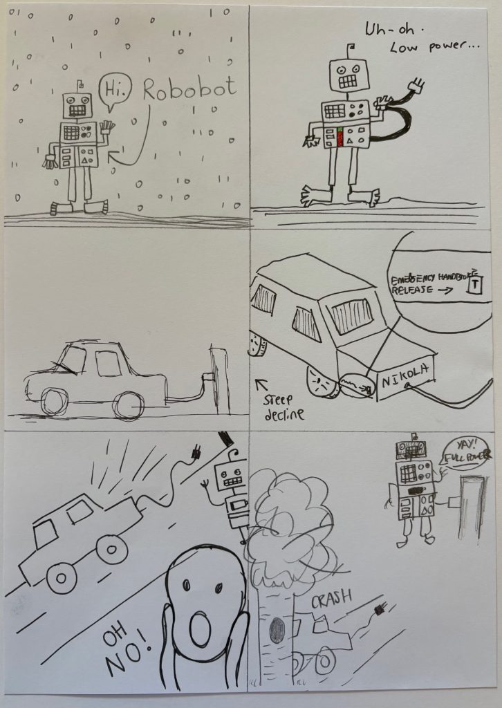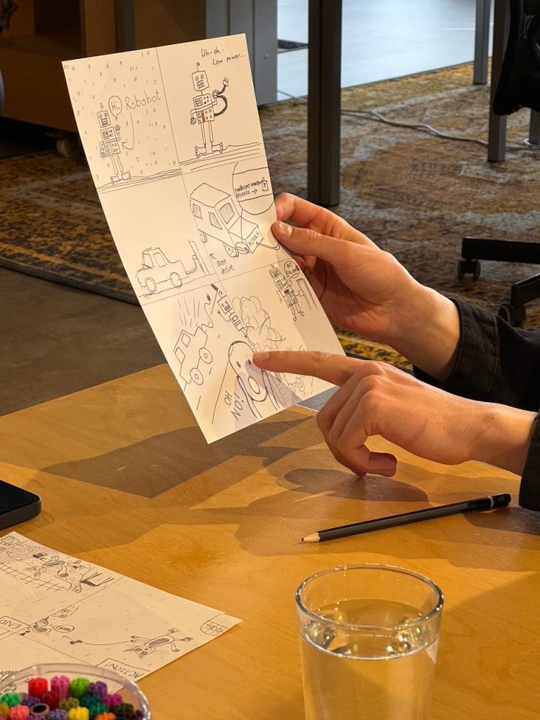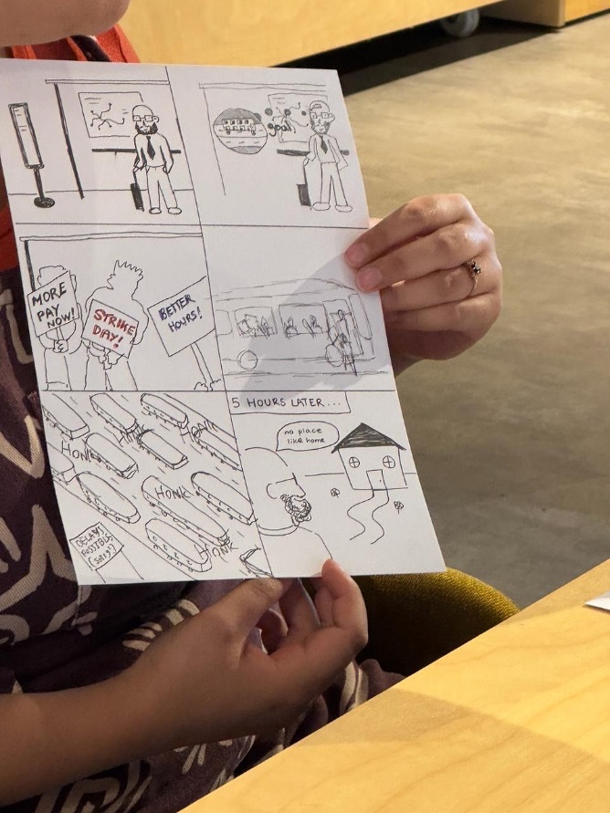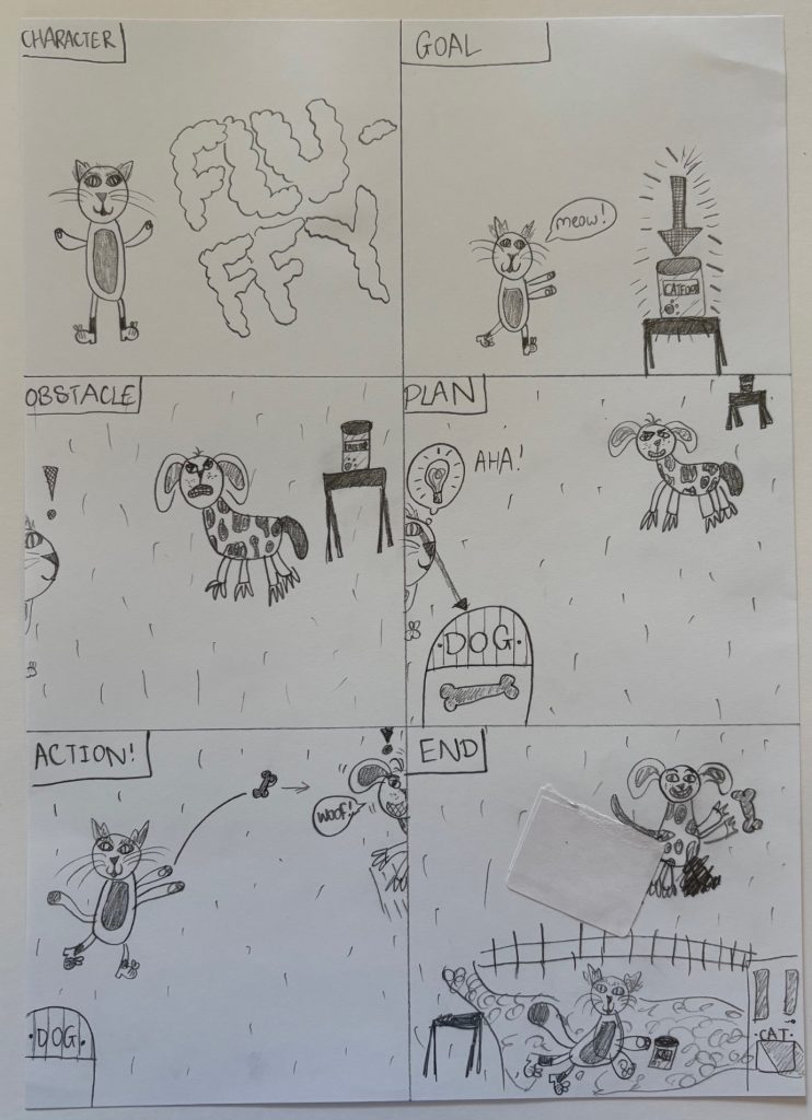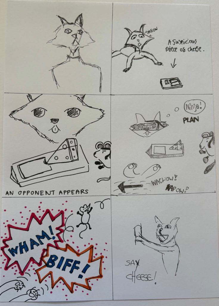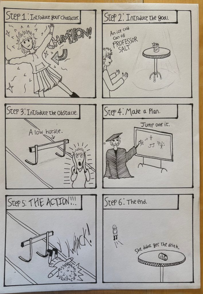 Participants learned from the young leader how to tell a story through a 6-panel cartoon. They were given just five minutes each to draw an initial panel introducing the character of their story, then a second panel outlining that character’s goal. Panel 3 introduced some kind of challenge or barrier, and panel 4 was the character outlining some kind of plan. Panel 5 was the plan being enacted (perhaps successfully, perhaps unsuccessfully), and the last panel showed the end result.