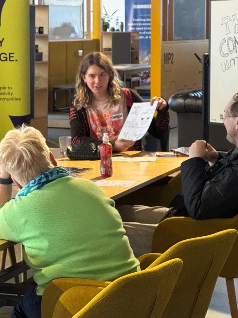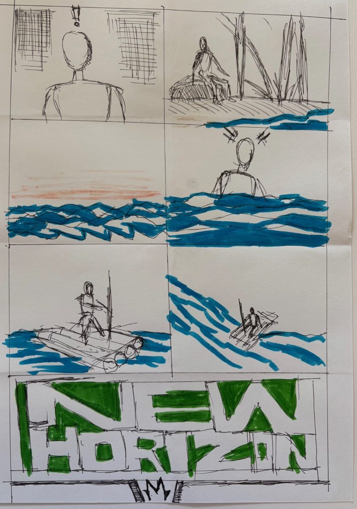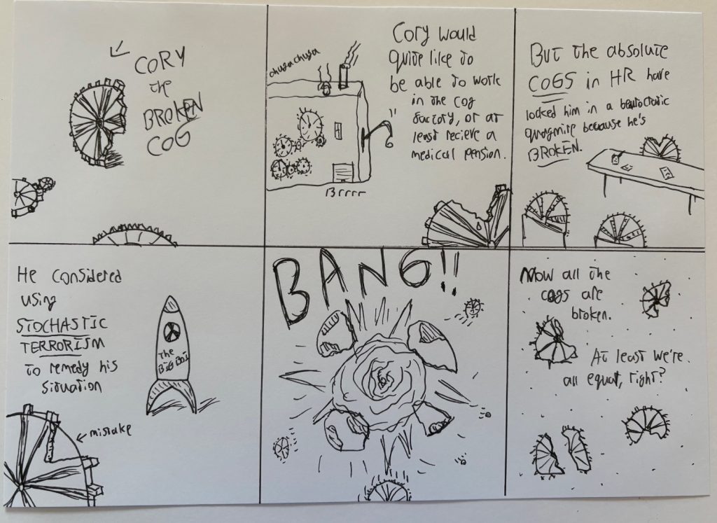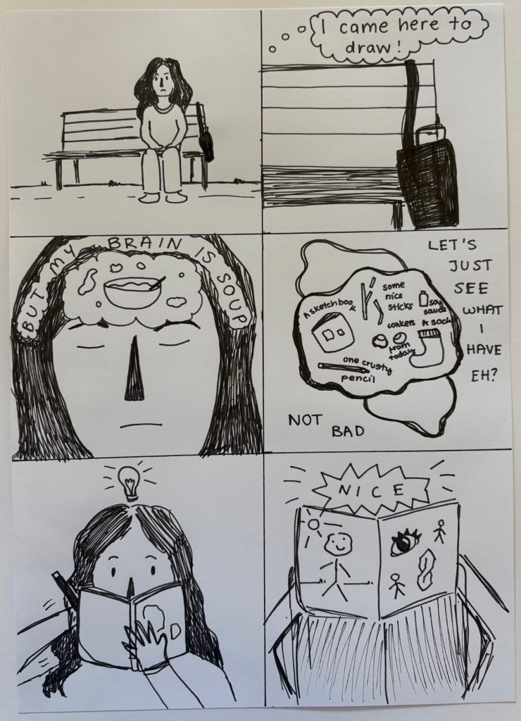 Everyone was encouraged to draw in pen if possible, to help them avoid overthinking what they were doing – mistakes were fine, just get the story down. Participants really learned from each other as work was shared, including seeing some people using very different viewpoints to add drama (focusing in or zooming out), using colour and using sketchier styles. They also noted the effect of using words or not, and how challenging but effective it could be to avoid words within the cartoon altogether.