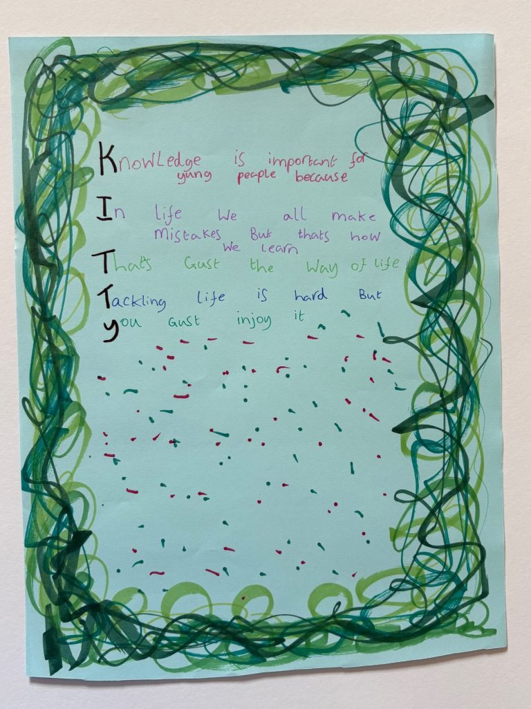 Participants began by writing ‘acrostic’ poems, using key words (either their first name or My Story) to give the first letter of a different word or line that together would form a poem. This helped everyone to feel that they could write a poem, no matter if they’d had experience of doing this before or not.