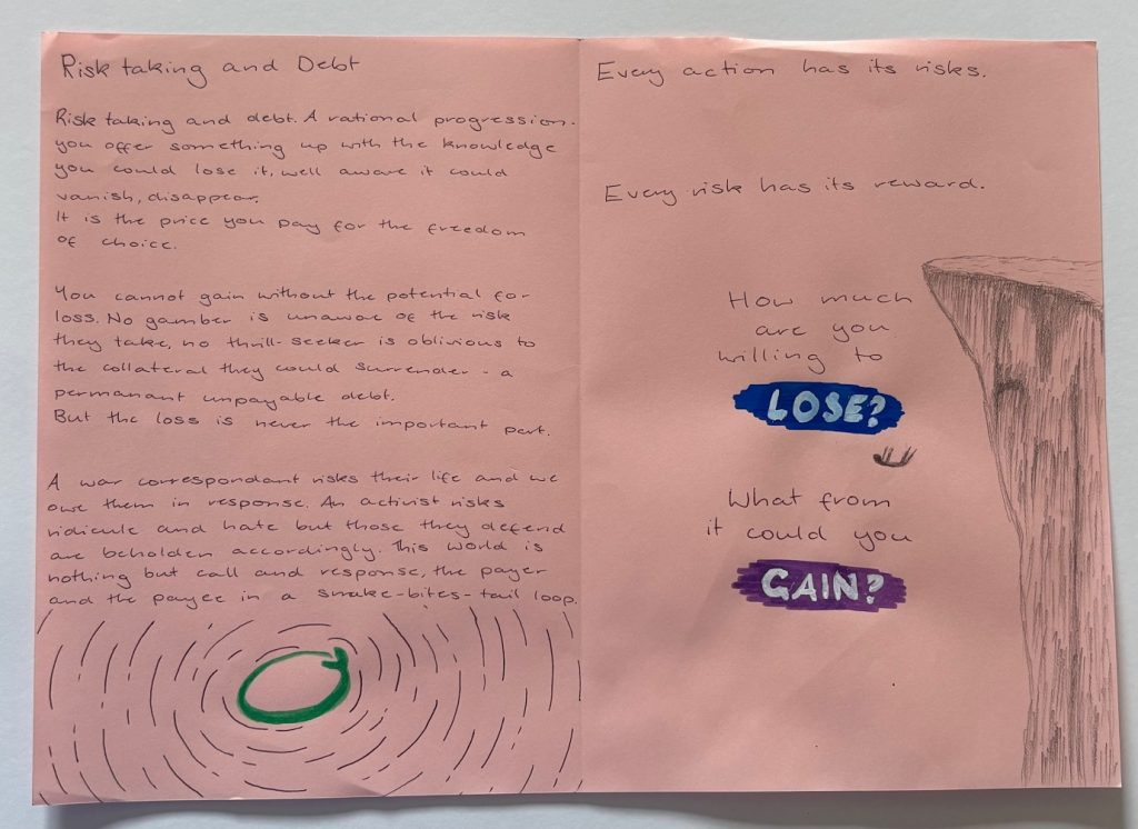 ‘I wrote 3 things, but the one I chose to write up neatly for the exhibition was about my struggles with identity and dissociation: trying to make a name for myself and be someone I’m proud of while resenting some of the ways mental illness affects me.’