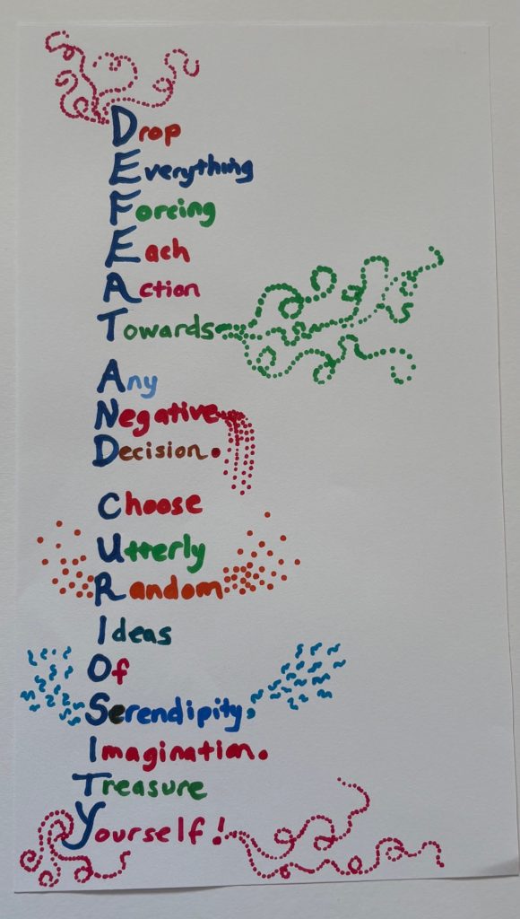 ‘I loved having the challenge of writing about two contrasting words I’d chosen at random. I made an acrostic poem from my two words, I really liked the idea that the negativity of defeat could be transformed into something so positive and open, coming from curiosity.’