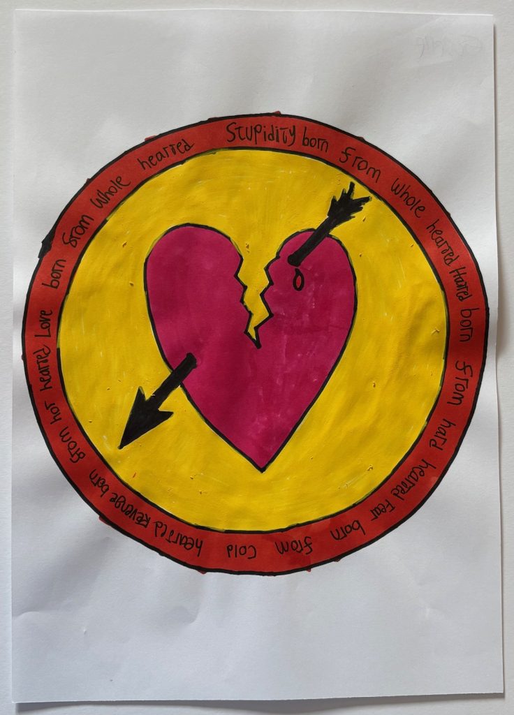 The design is meant to symbolise a coin ie love and hate are two sides of the same coin.’