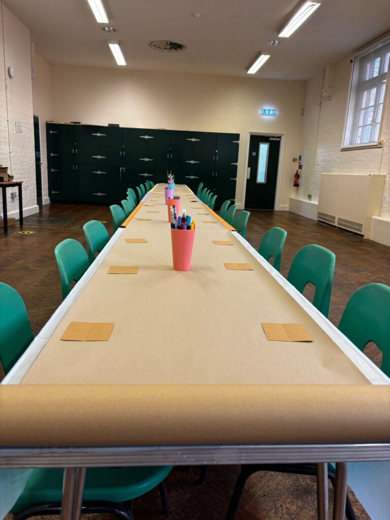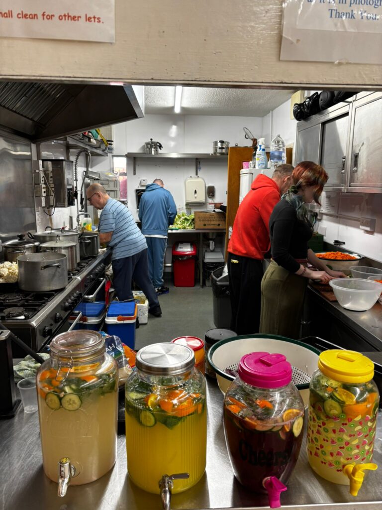 Participants work in small groups of eight, taking turns in the kitchen. While waiting, everyone is invited to join a free creative wellbeing workshop — offering space to reflect, connect and express themselves.